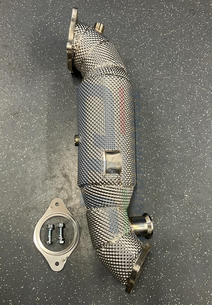 Stainless steel freeflow downpipe with exhaust armor. Replaces the stock catalyst and particle filter (if applicable) with a 200 cell race cat and comes with all sensor connections and EGR port. All 2.0T engine versions selectable.